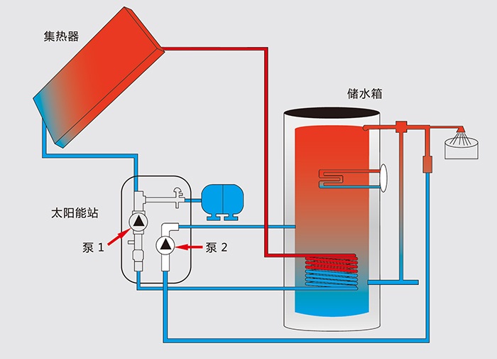 太陽(yáng)集熱器與儲(chǔ)熱水箱循環(huán)系統(tǒng)采用防凍介質(zhì),能耐-40°C低溫,適用性強(qiáng);